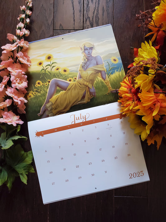 A pin-up calendar of fantasy elves representing the four seasons, winter, spring, summer, and autumn.